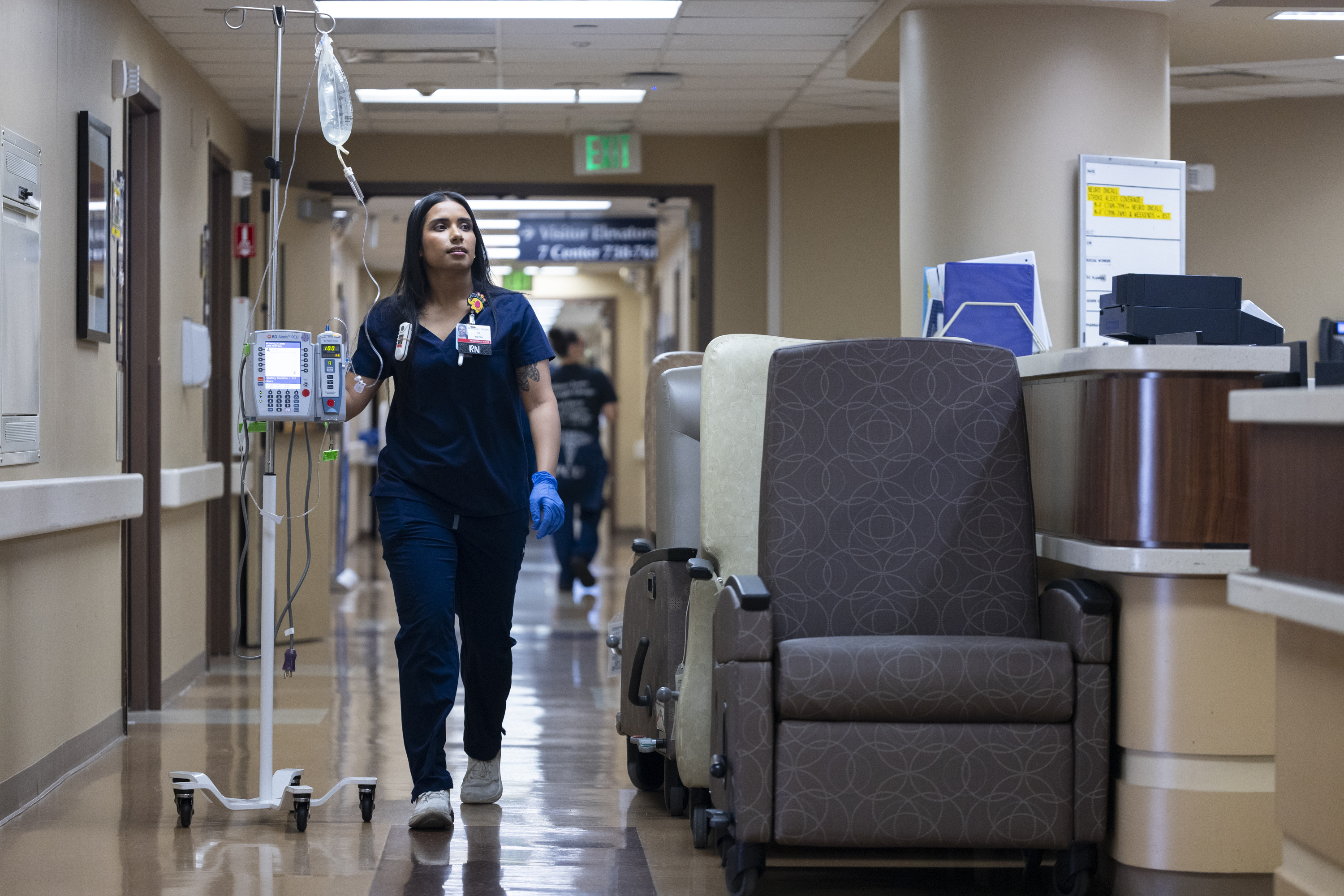 As she moved medical equipment to the other section of the floor, Purewal remembered another reason why she got into nursing. When she was a patient care assistant, she formed a special bond with a patient who was about to be discharged to hospice care. Purewal talked to her about how she wanted to go to nursing school and remembered helping to bathe her and make her laugh in an uncomfortable and vulnerable situation. After the woman later passed away, Purewal was informed by leadership that they received a letter from the patient’s sister — she had graciously left funds to Purewal to help with her school costs.