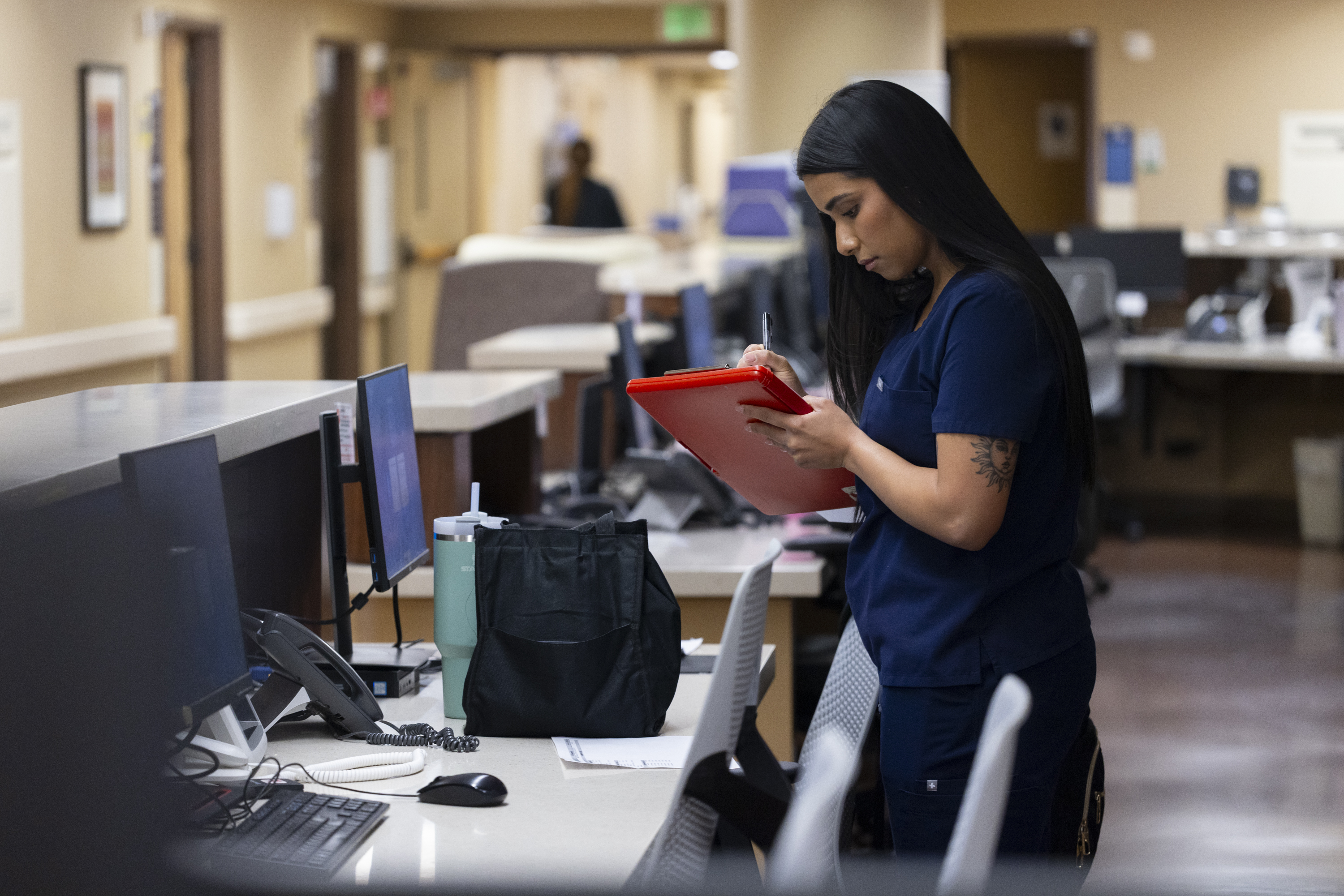 During their morning meeting, the charge nurse informed her team that they would need to open an unused area of the floor to make room for seven patients coming from the emergency department. Purewal took a report from the night shift nurses to get up to speed on the patients she’d be treating that day, then immediately started to prepare the north section of the floor, which she would be helping to staff.