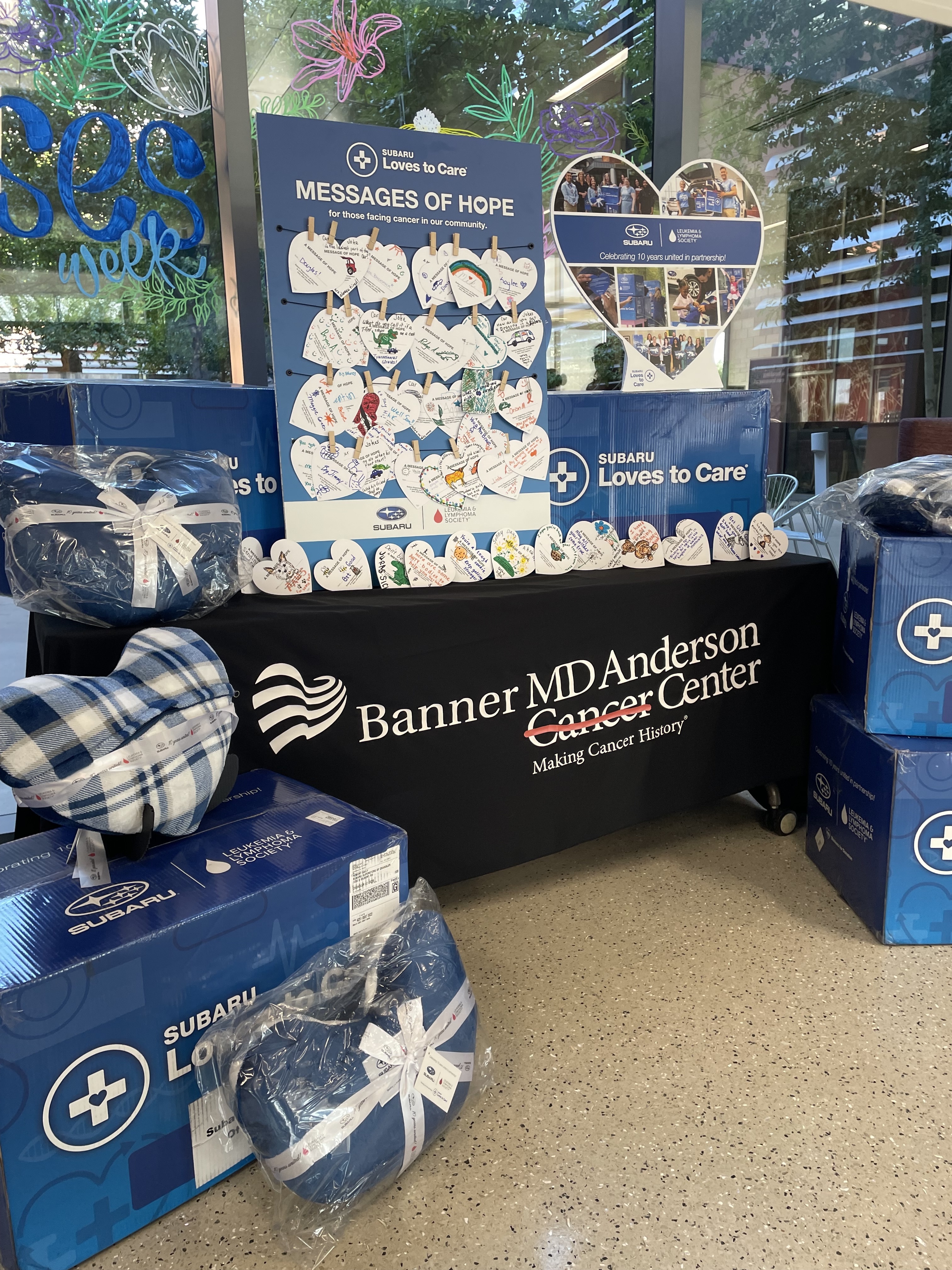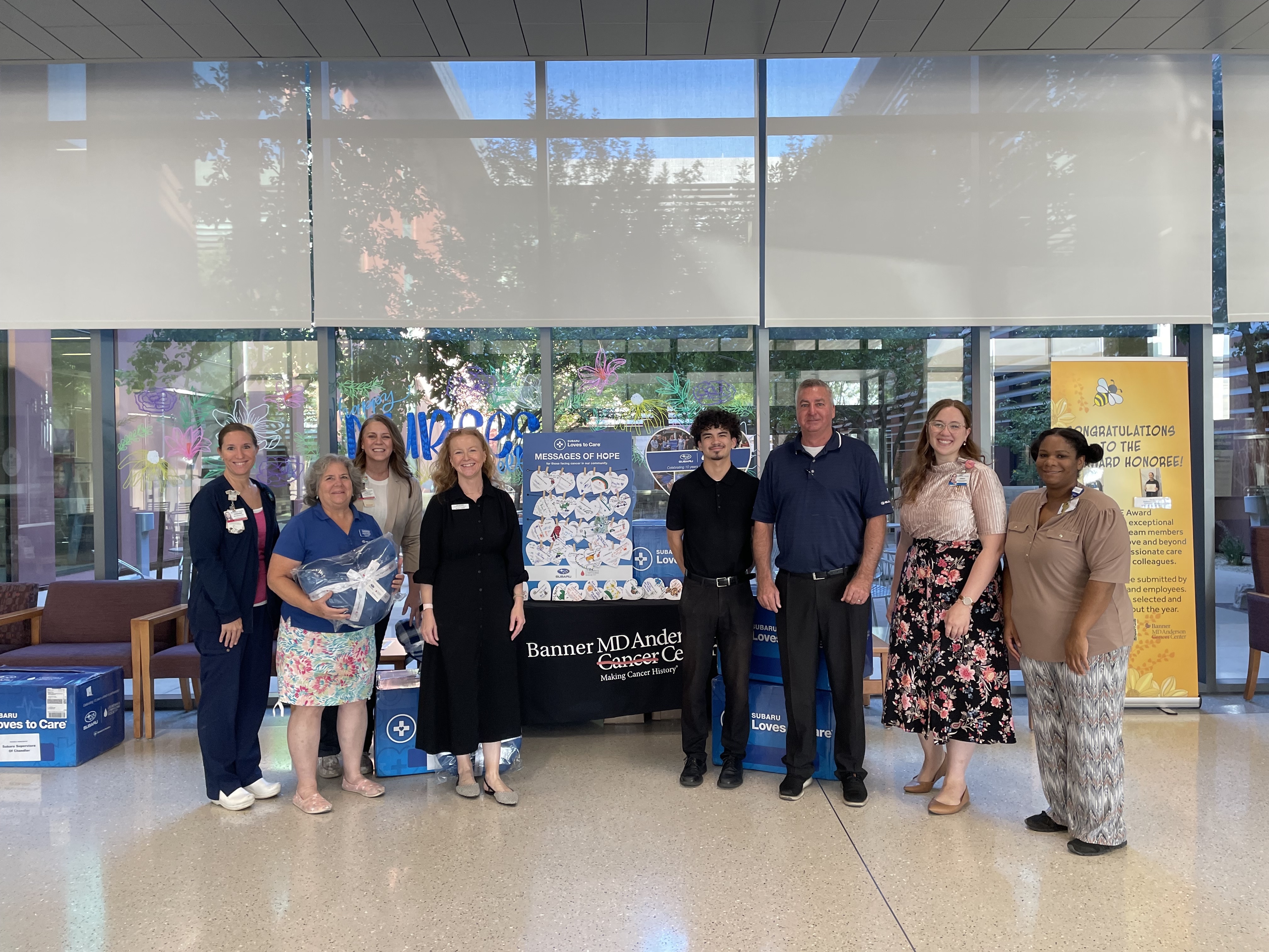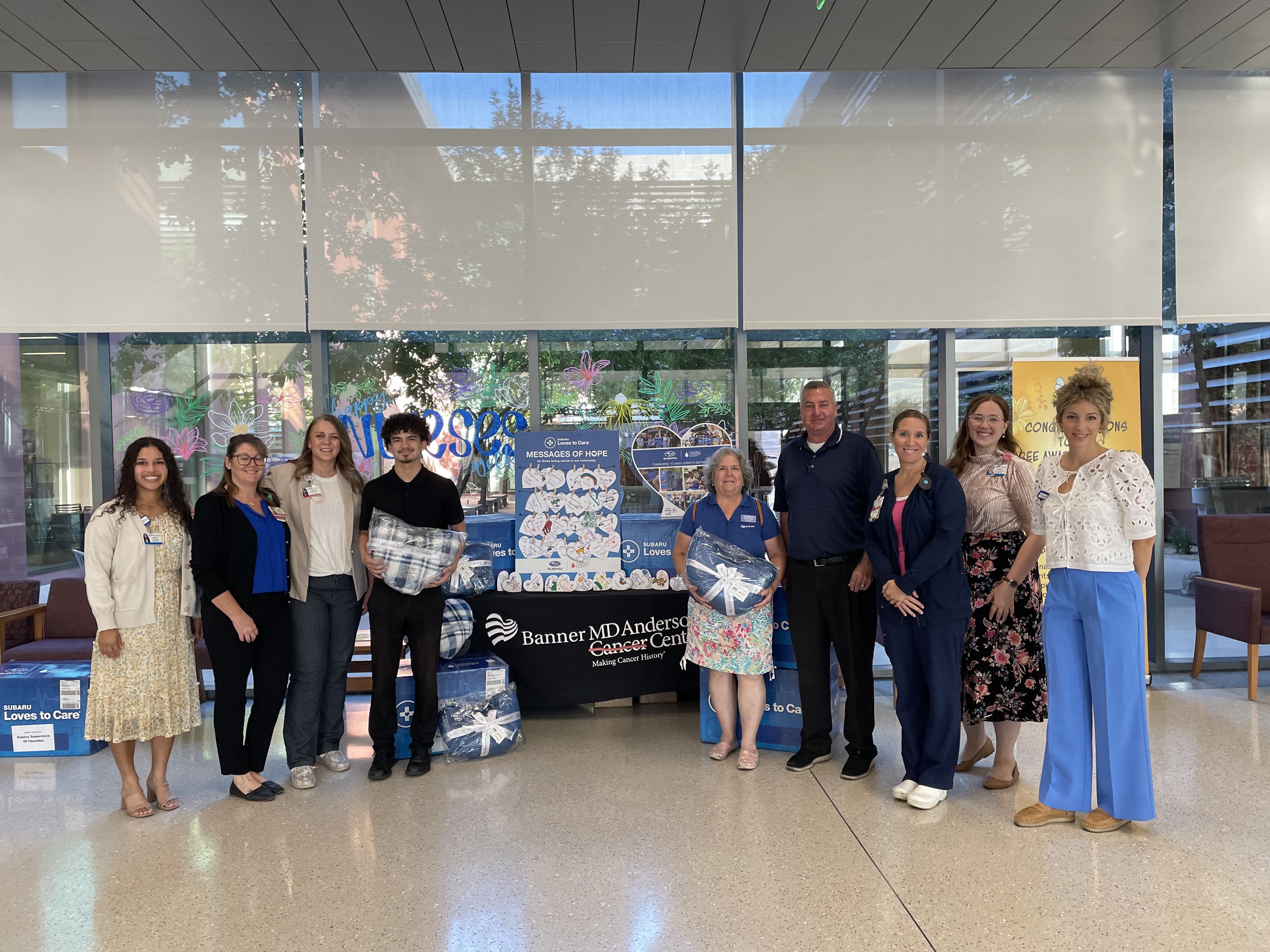 GILBERT, Ariz. (June 27, 2025) – Patients receiving care and treatment for cancer at Banner MD Anderson Cancer Center will find some extra comfort, thanks to a generous donation from Subaru Loves to Care, the corporate impact initiative of Subaru of America. The Subaru Superstore of Chandler on Tuesday dropped off more than 80 blankets and dozens of hand-written messages of hope to support cancer patients throughout their treatment.